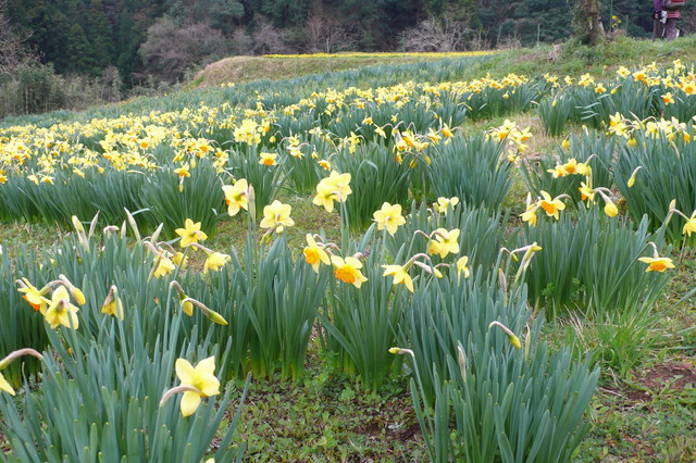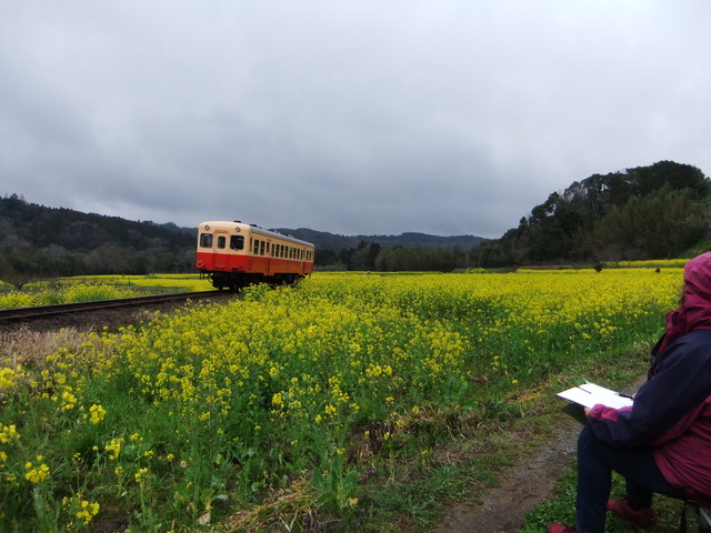天気予報は曇、何とか雨は大丈夫だと出掛けたが現地は細かい雨。リーダーの日頃の行いが悪いのではとの噂に耳をふさぎ、雨の中しぶとくスケッチする。午後は雨が止み養老渓谷・石神地区の広い菜の花畑に移りスケッチ。菜の花は満開、一面が黄色でその中を走るローカル電車をカメラに収めようとカメラマンが構える。 散策組は大福山に行く予定だったが、雨で計画変更、ゆっくりと養老渓谷を散策。菜の花はないが水仙が見頃、養老川のほとりを涼やかな音を聞きながら歩く。桜は開花したばかり、今月末から来月初めは菜の花と桜、両方が見頃になるだろう。養老渓谷駅15時過ぎの電車で帰途、しかし片道約3時間、遠いネ。 A記