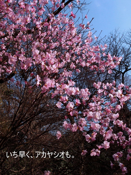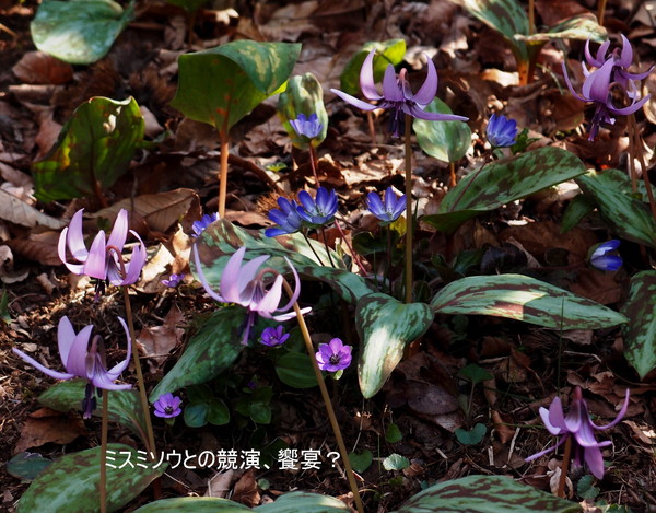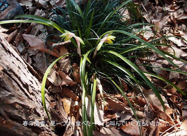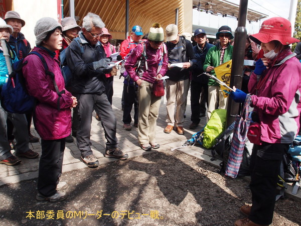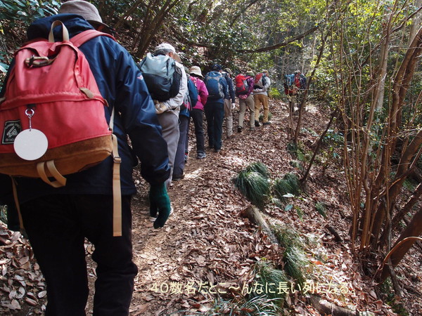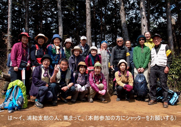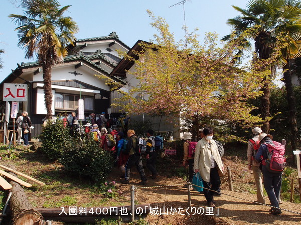 今回はリーダーのSさんの本部合同初の山行で42名の参加がありました。日曜の首都圏での人気登山スポットの高尾山口駅前に集合で、暖かくなった日曜日のため、大勢の登山客が集まり、わかり易いように新ハイの旗を持っての受付です。人員が多いので2班に分かれて、出発。国道20号線を渡り民家の間を縫ってすぐに登りにかかりました。高尾山のメインルートとは違い、登山客は少なくいつもの高尾山とは違った感じです。それでも首都圏の山なので、他のグループ、トレールランナーまた旅行会社のハイカーとまずまずの人出です。早春の山は、まだ木々や草花は、あまり花をつけておらず、芽吹いてはいますので2、3週間後には、ツツジ他の花が咲き誇ることでしょう。そうする内に、草戸山364m到着しちょうどお昼です。松見平休息所と掲示があり平で広い山頂です。眼下に人工湖の城山湖を眺めながら、ゆっくりの昼食タイムを取り、集合写真を撮って、出発。今回の最高峰榎窪山420mを超えて下る。城山湖の発電所の脇を通り、グラウンドのあるコミュニティセンターで最後の休憩。県道を通り最後の目的地城山カタクリの里に到着。人員が多いのでここで解散し以降、三々五々園内を見学。ちょうどカタクリの最盛期、ピンクの他、黄や白ものもあり、斜面を覆い圧巻でした。草花は、雪割草、花大根他、木花は、みつばつつじほうき桃、菊桃等々。案内書に数十種類の種類が、書かれ斜面や散策路に咲き誇っていました。(T 記)