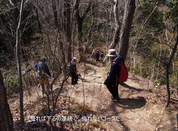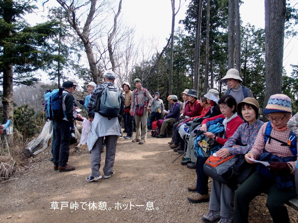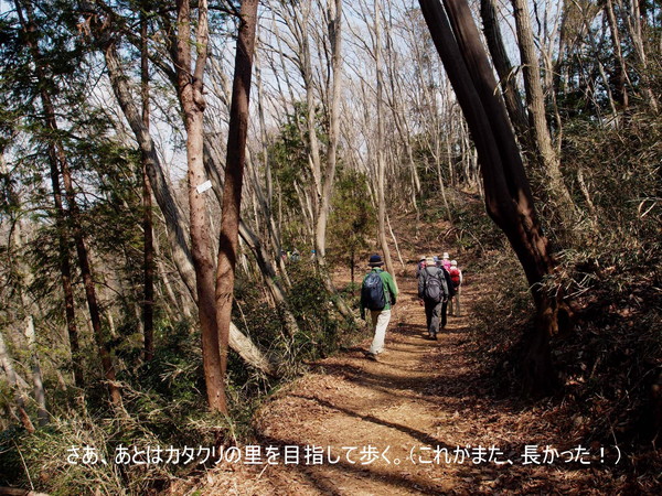 高尾山口駅9:30?四辻9:50−草戸峠11:05−草戸山11:20/12:00(中食)−榎窪山12:30−城山湖散策施設コミュニティセンター12:58/13:15−金毘羅宮13:20−城山カタクリの里14:05(解散)