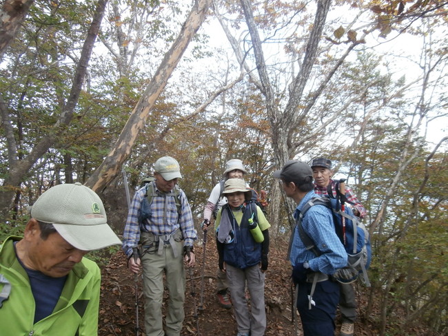 期 日 2016年10月23日(日) 当初染谷リーダーは「この時期の鶴ヶ鳥屋山だから紅葉が見頃(?)」と見込み計画したが紅葉にはまだまだ早く「期待外れ」でした。このコースの前半部分は去年9月中旬頃新ハイ本部山行で歩いた事があり染谷リーダーは「下見の際も発見できなかった三角点がわからない」と話していたがあっけなく発見(通常は三角点には色がついていない)、登山道の下を通っているリニアモーターカー実験線を跨ぎ林道に出て短い休憩を取って角砥山山頂に11時過ぎ到着、富士山の眺望が良いとの事だったが生憎の靄の中(前衛の三ツ峠山は確認できた)、見た目急坂を下りヤグラ(船橋沢分岐)を通過午後1時前に鶴ヶ鳥屋山に到着記念写真を撮って昼食、後はほぼ下り(一部急坂があったが)で上りで通過した林道を跨ぎ沢を渡渉凸凹の歩きにくい林道を歩き国道へ出て今度はリニアモーターカー実験線の下を潜って足並みが揃っていた為か予定していた下山時間より約30分ほど早く初狩駅へ、午後4時過ぎの電車に乗り帰路に就いた。 (T記) |