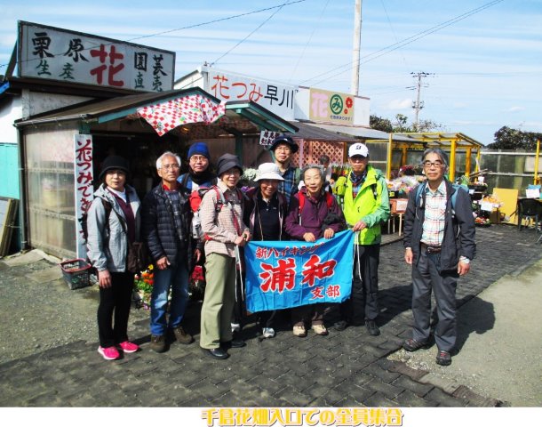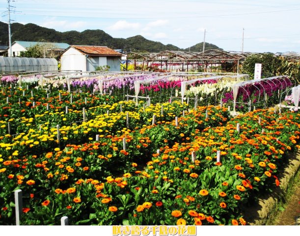 海岸美術館からまた山道を経て海岸沿いの道にたどり着き、海をみながら歩くことになったがやや曇り気味の天気のため、海の青さ、空の青さの爽やかさは今一歩。それでも広々とした海、遠くに行き交いする大型貨物船を見ながらの海岸線歩きは気持ちがよい。「清国元順遭難救助」の碑がある南千倉海水浴場で休憩をとったが、関東近辺からきているサーファ−が結構いてやや荒い波乗りを楽しんでいた。日曜日ということで舟は出ておらず漁港は閑散としており、観光地であるがお店も少なく、あってもほとんどが休業で観光地の華やかさが見られなかったのは残念。後述の「道の駅」ができたためか。千倉の花畑は幾つものエリアがあり、ゆっくり休憩ができる道の駅「ちくら・潮風王国」を目指して歩く。道の駅に到着するまで時間がかかるということで途中の漁港海岸で昼食。道の駅に 到着すると大きな立派な建物がり、駐車場には大型観光バスが多く並び、広々とした芝生公園もあって非常に混雑していた。道路反対側の花畑入口には、花摘みの道具を貸し出し、切り花を販売する小屋が立ち並び、 花畑には色彩豊かに菜の花、ポピー、色違いのキンセンカ、矢車草、ストックなどが咲き乱れ、房総千倉の地はまさに春爛漫、観光バスで訪れた多くの花摘み客が思い思いの花を摘んでいた。「ちくら・潮風王国」で海鮮バーベキューなどと思っていたが、混雑ぶりが甚だしく時間余裕などほとんどないため断念。建物内の店で魚介類を土産に購入。