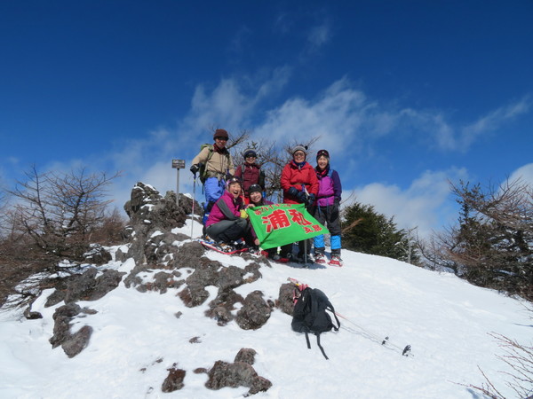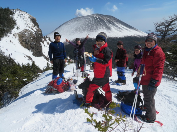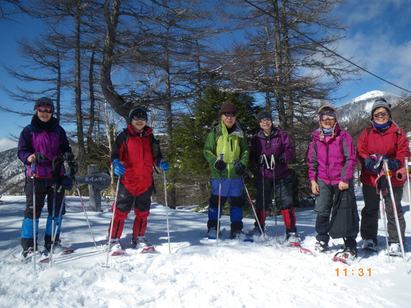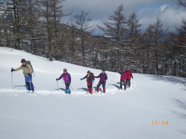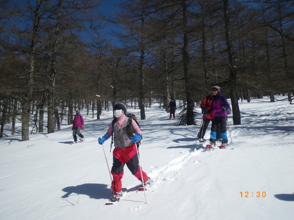 峰登山口から新雪のスノーシュー登山、ゲレンデ横断禁止標識に従い、林の中