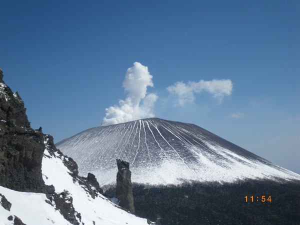 に八つヶ岳、後方に草津白根山が白くかすんで見える、すぐ下の高峰神社に感