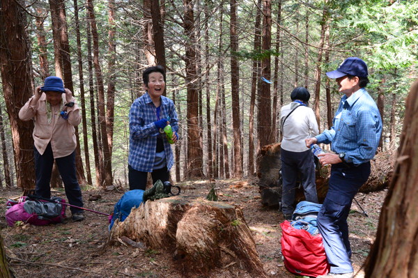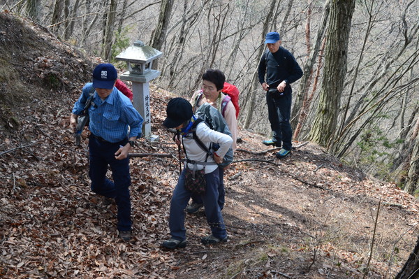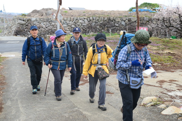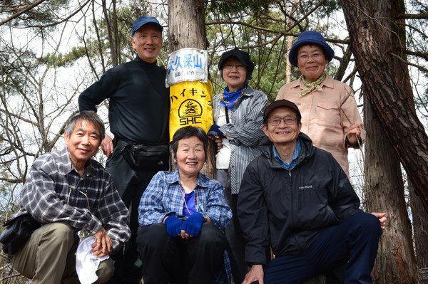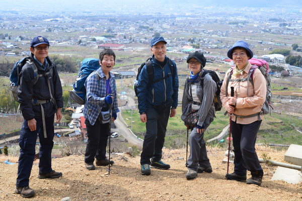 天気予報は下り坂、登山口に着くころには雲が多くなってきた。歩き出して間もなく小雨が降ってきた、今日はこのまま雨の山行になるのかと思いきや、天候は回復してきた。ラッキー!登山口からは桃畑の中をゆく、今年は例年より開花が遅れているようでまだつぼみがほころんだ程度。でも、下に生えるホトケノザやオオイヌノフグリなどの野草たちが心を和ませてくれる。しばしの急登の後蜂城神社に到着小休止と証拠写真撮影後神領山に向かう、ここも急登だ。神領山ではお待ちかね昼食と大休止。最後の大久保山に向かう。ここで2度目の証拠写真撮影をして無事下山口に到着した。帰りのバスの時間まで博物館とワイナリーを見学、バスの時間までよもやま話に花を咲かせ、楽しい山行が終了した。
