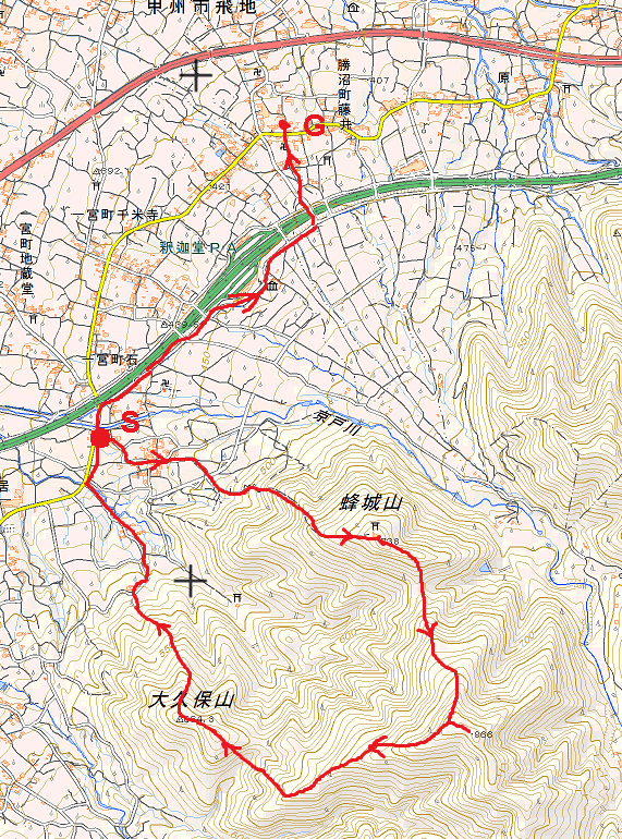 蜂城山−神領山−大久保山 コース図 S:スタート G:ゴール