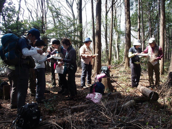 コンパスって、磁石のことなの?わたしは、円を描くためのあのコンパスかと思ってた。持って来なくて良かった、というOさんの言葉に、おお、そうきたか、と笑った自分も地図に合わせてコンパスを使った経験はなかったので、少々面倒に思いながらの参加だったが、いや〜、目からウロコ。きちんと、磁北線に針をあわせると、目指す方向にピークが見えたのには感動。(おおげさか...) |
